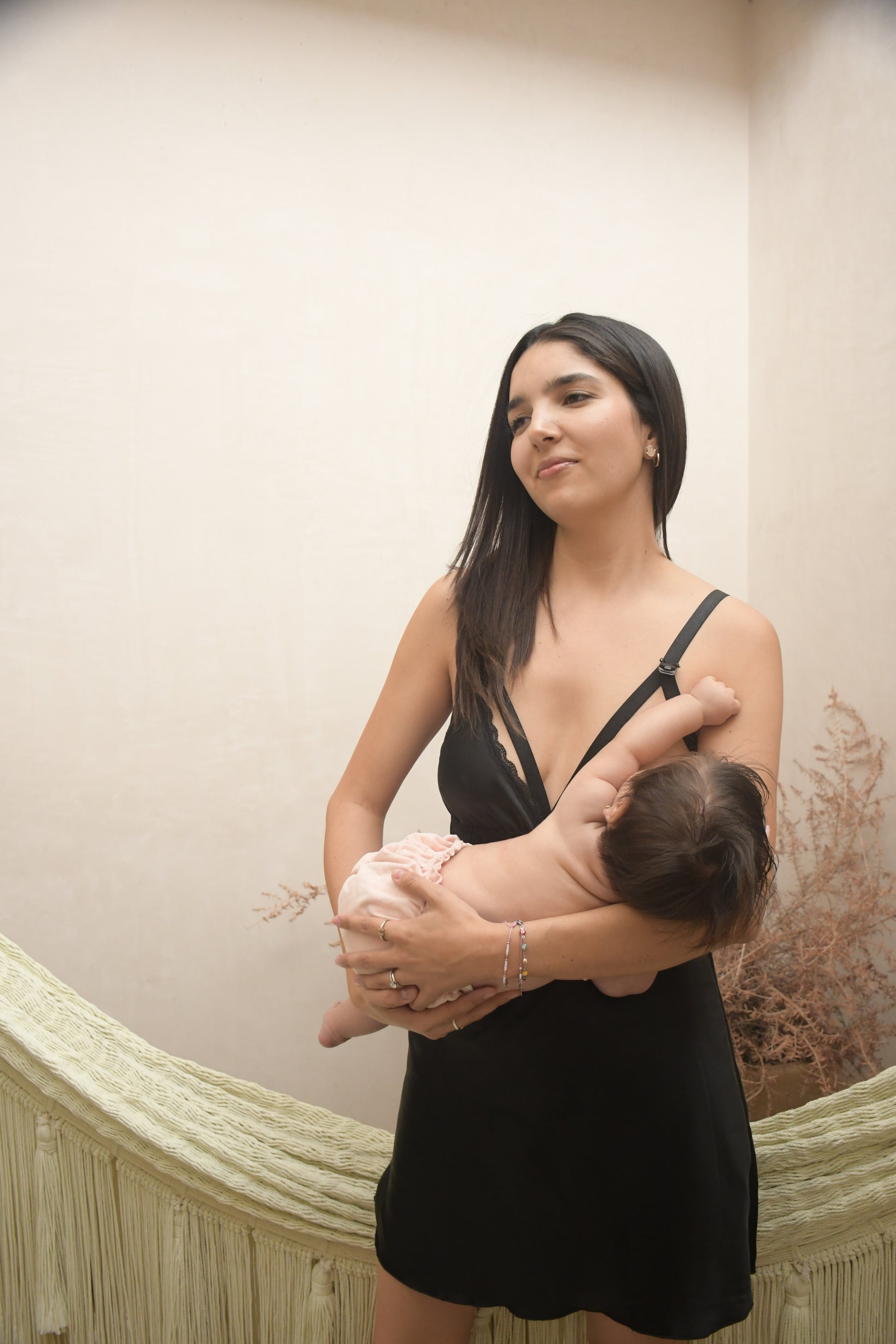 Vestido de maternidad en charmeusse con broches para lactancia, detalles de encaje y tirantes ajustables