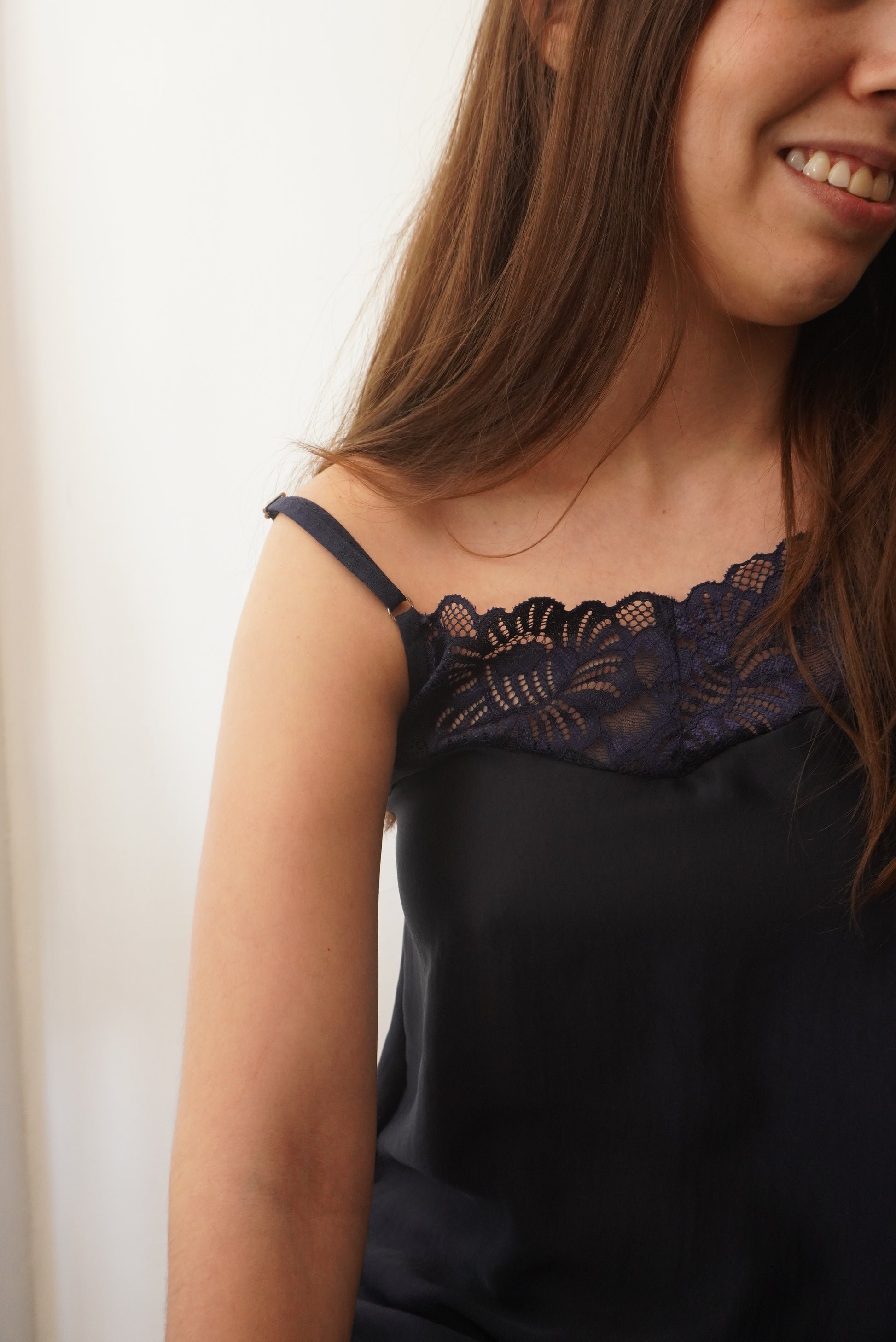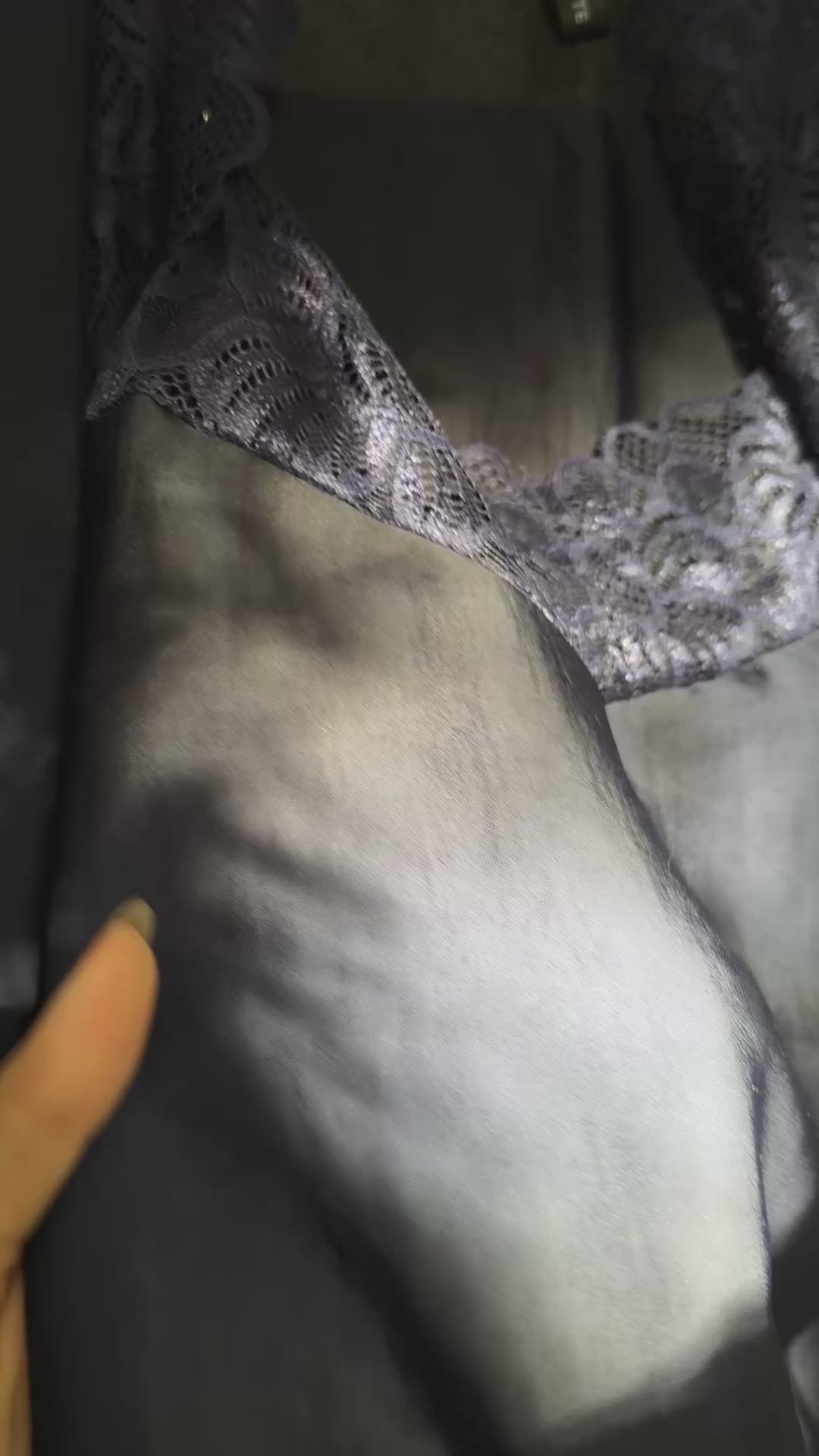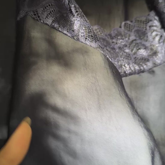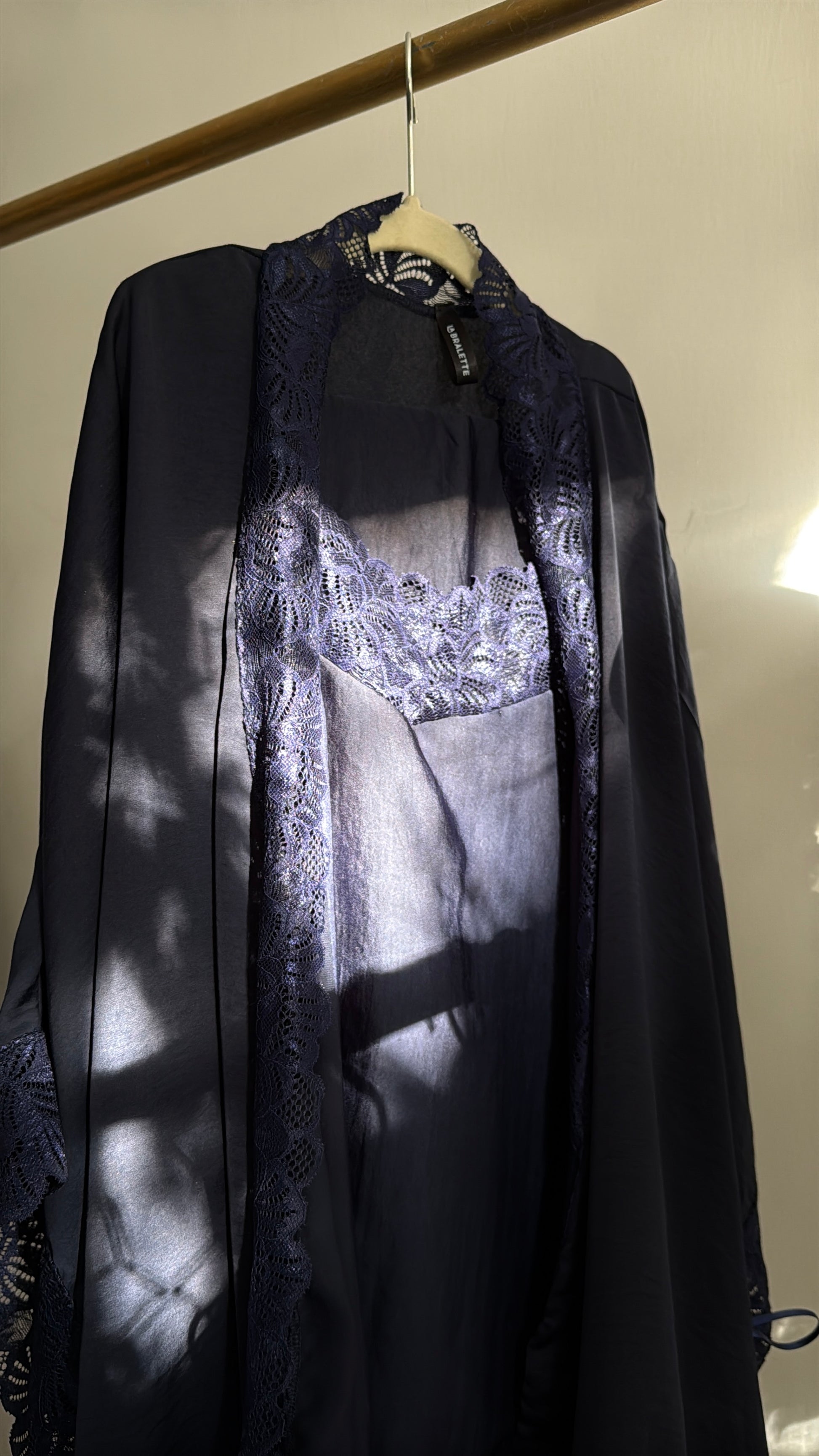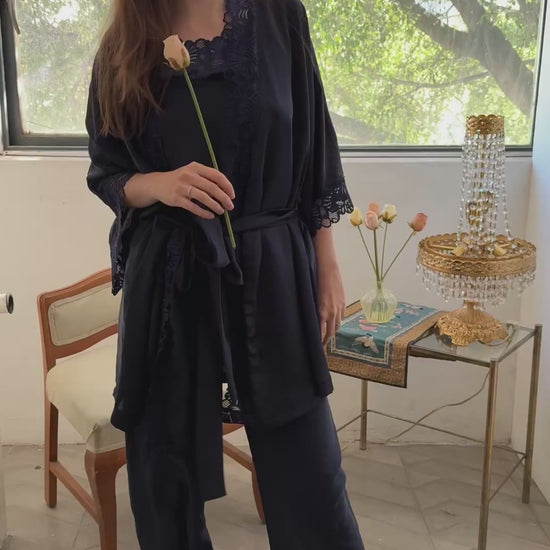 Set de 3 piezas: bata + blusa + pantalon en tipo seda con detalles de encaje.