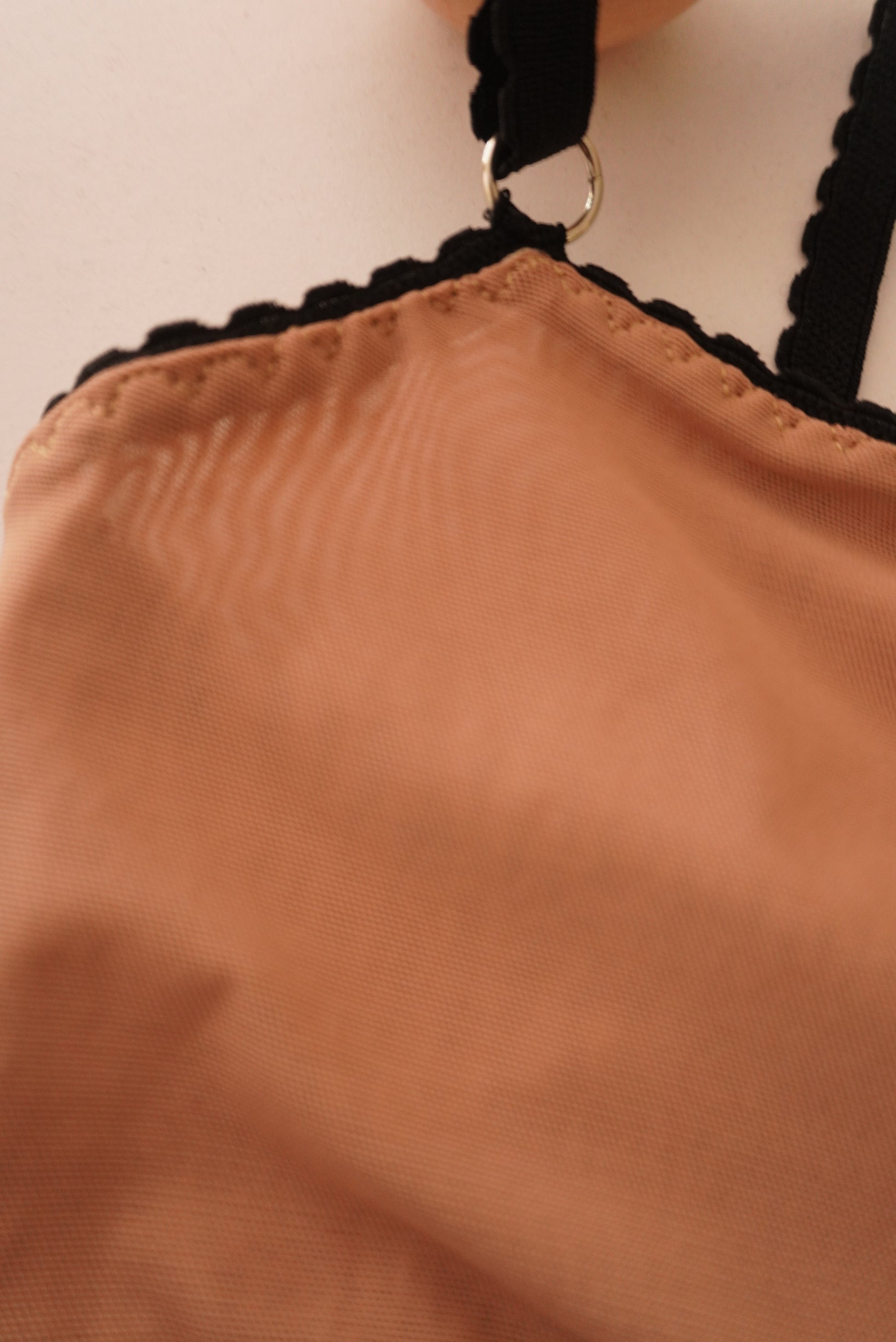 Top con escote en U, doble capa de mesh en la parte frontal que da soporte y evita transparencias, tirantes ajustables y detalle de encaje en la parte inferior