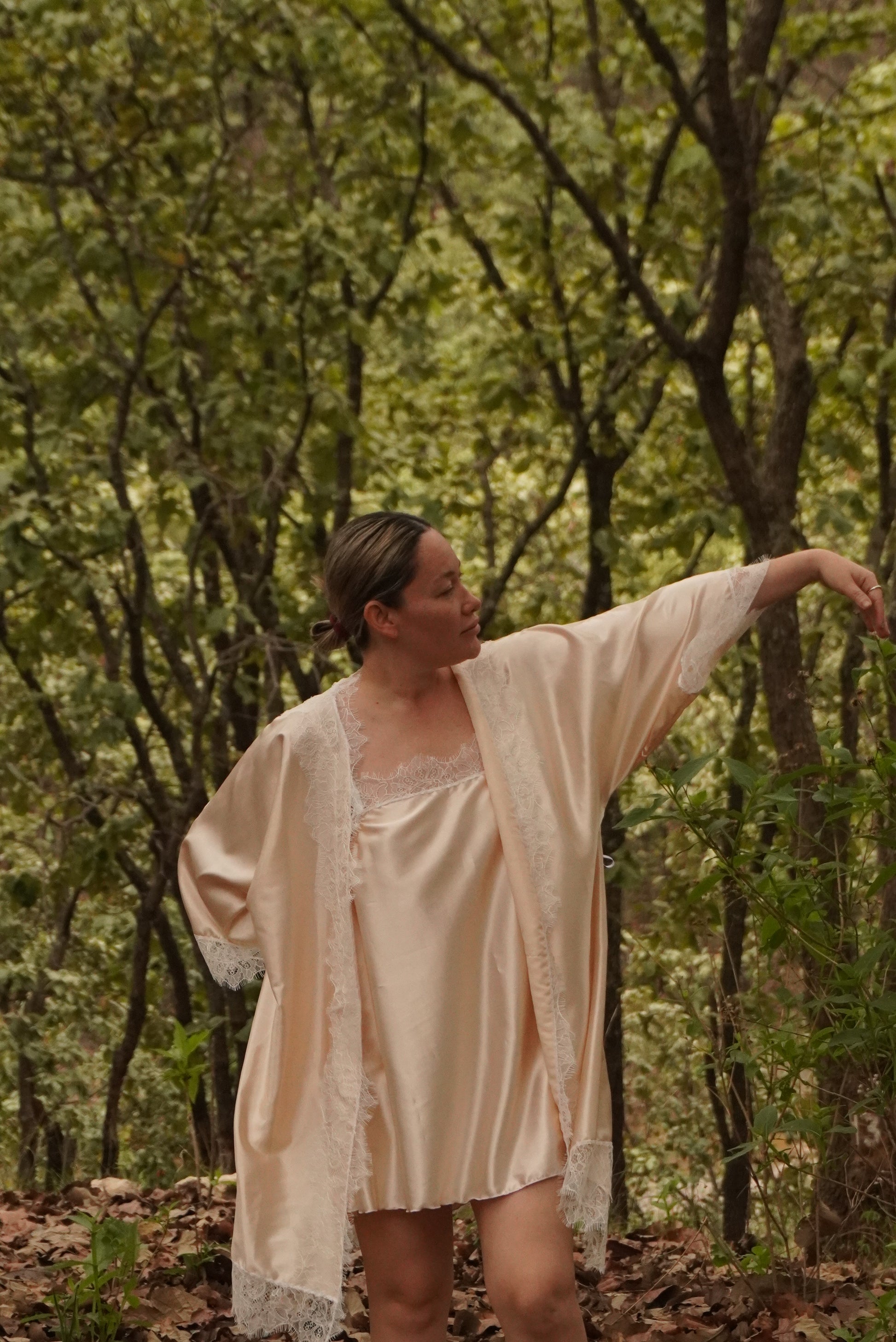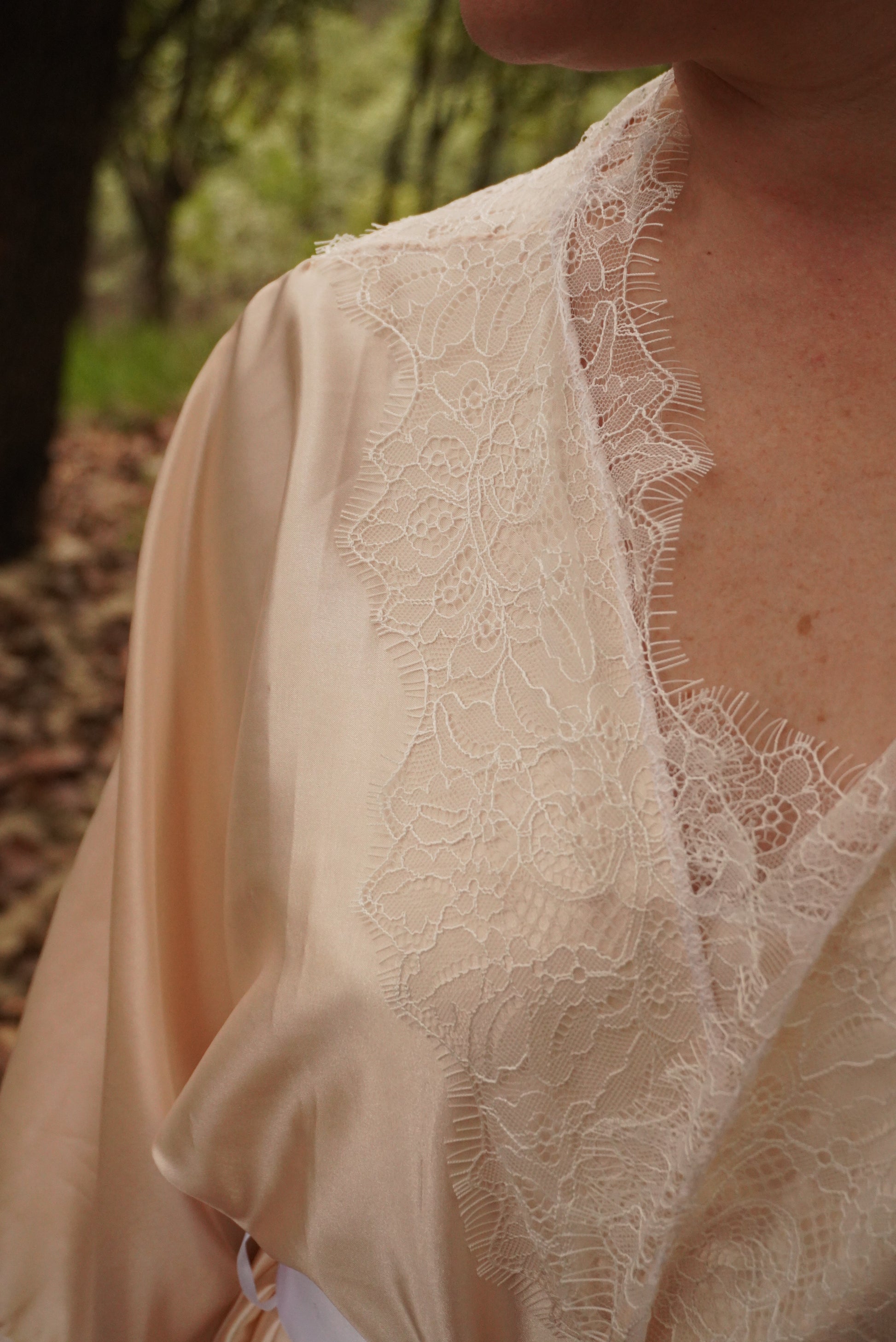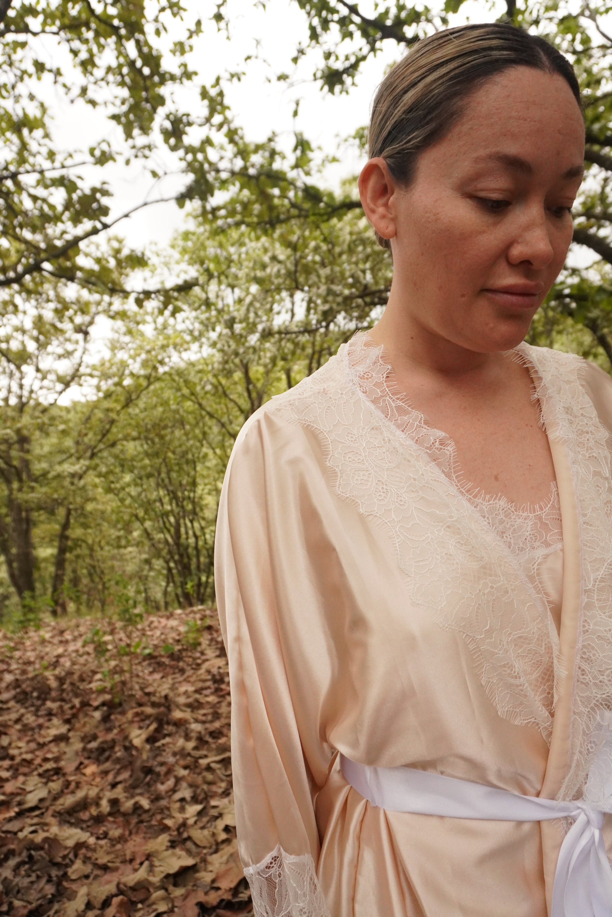 Bata de charmeuse con detalles de encaje, lazo cinturón y lazos en interior para un mejor amarre.
