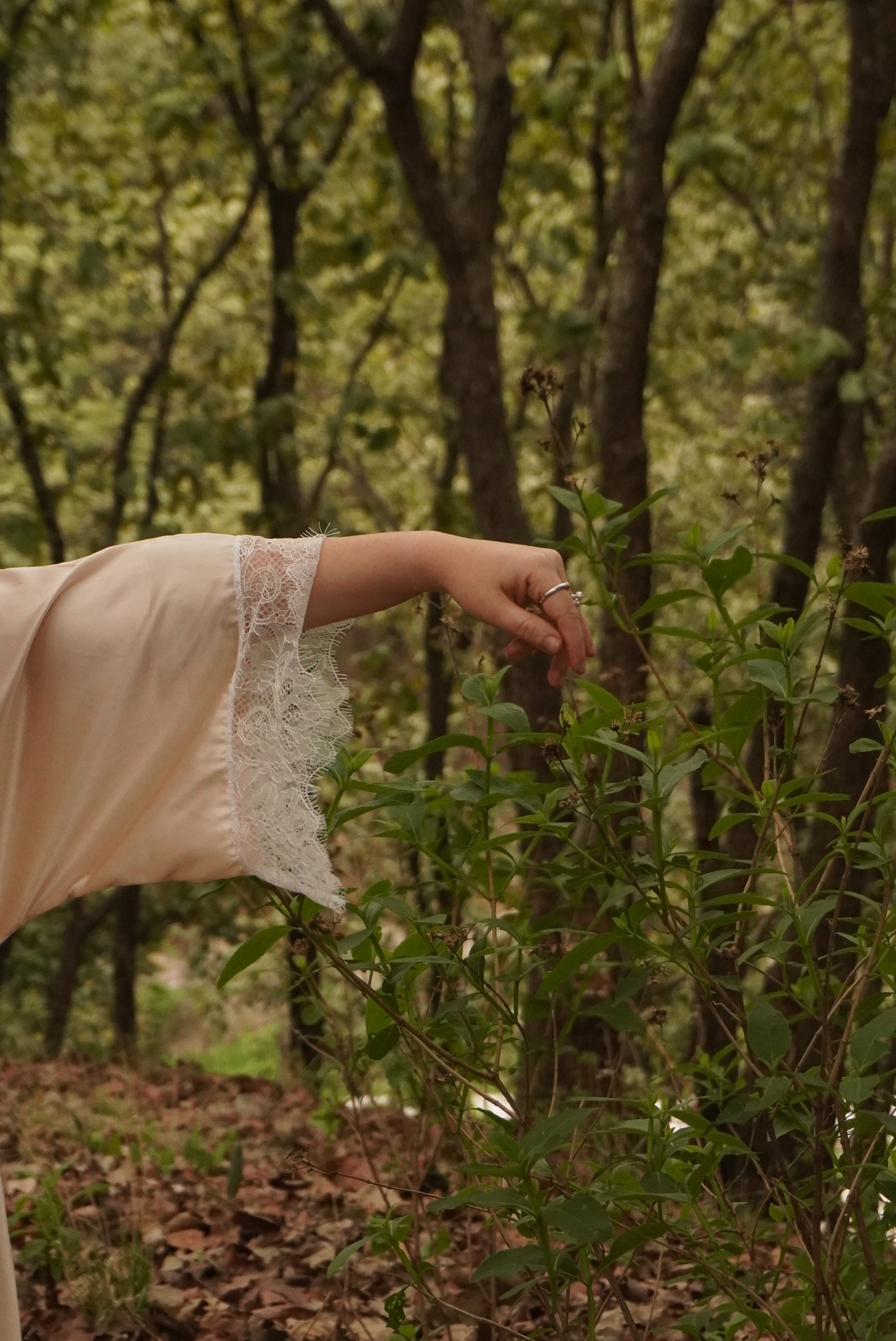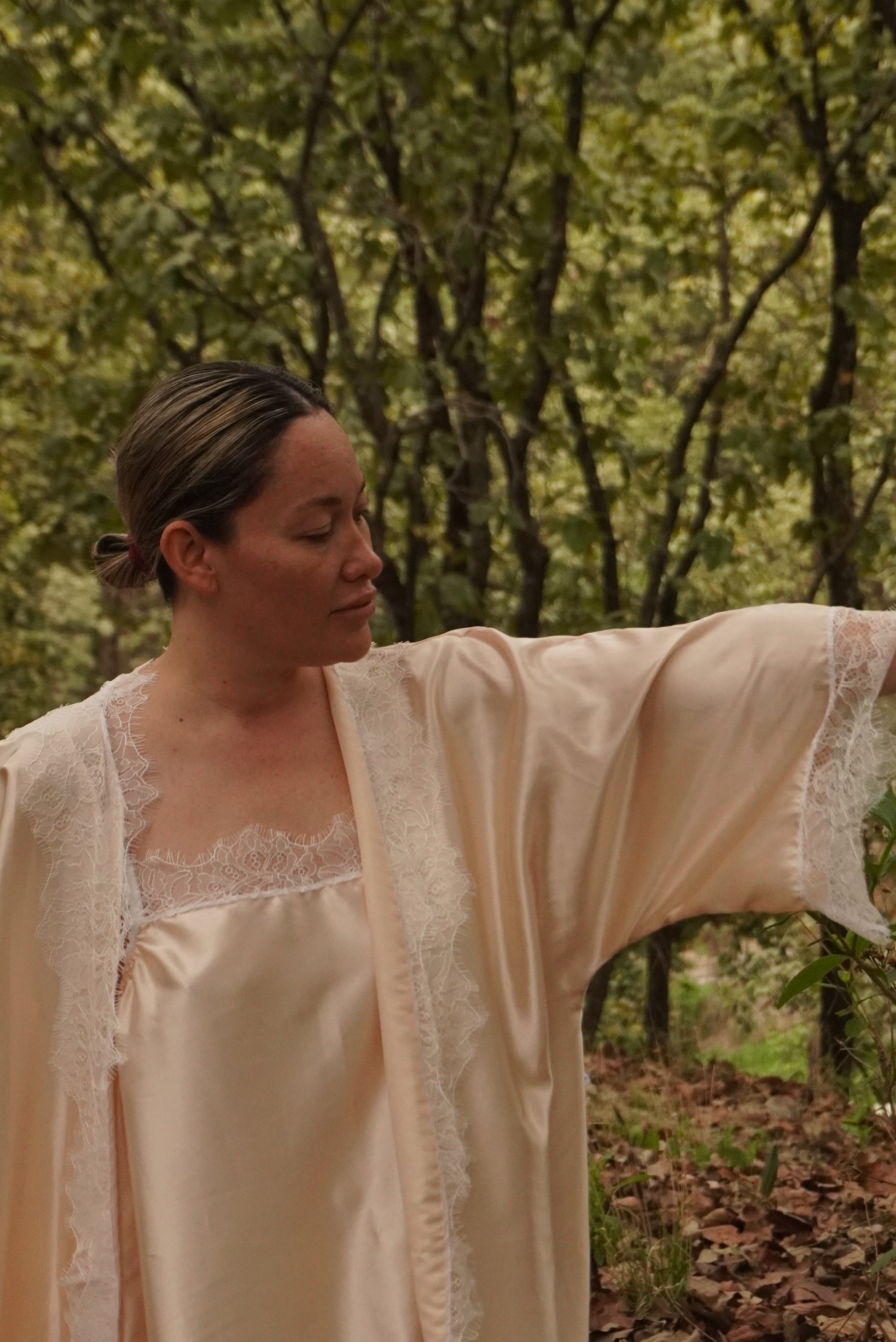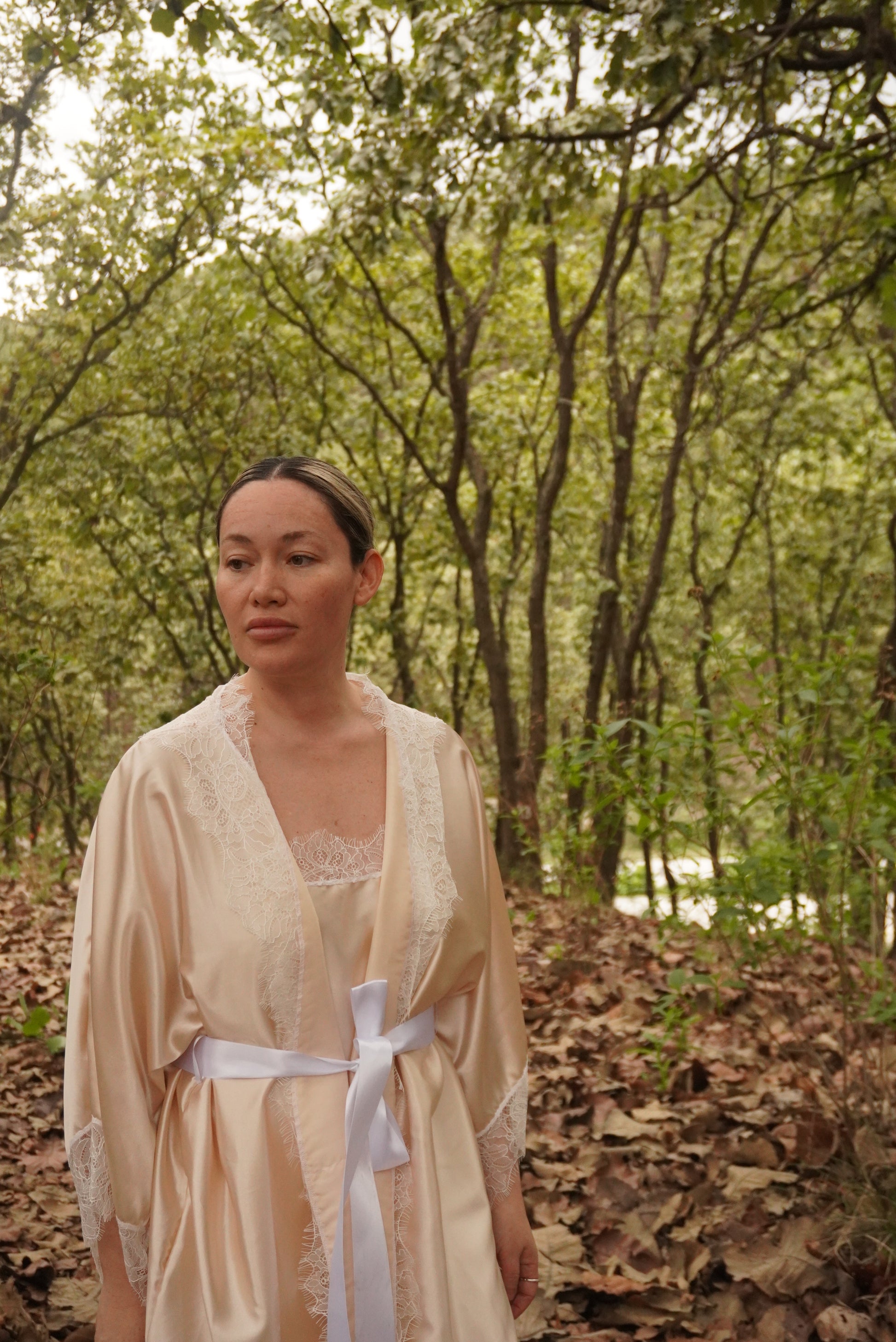 Bata de charmeuse con detalles de encaje, lazo cinturón y lazos en interior para un mejor amarre.
